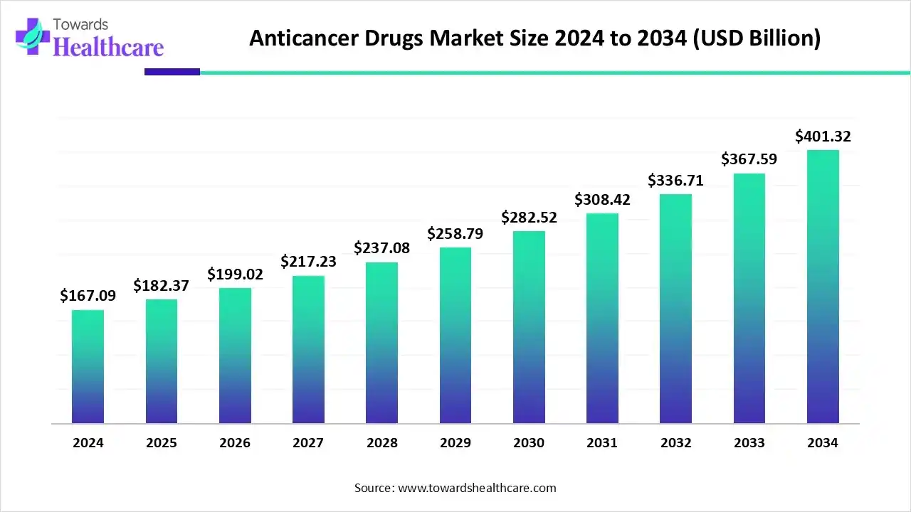 Ottawa, Nov. 21, 2025 (GLOBE NEWSWIRE) -- The global anticancer drugs market size was valued at USD 167.09 billion in 2024 and is predicted to hit around USD 401.32 billion by 2034, rising at a 9.14% CAGR, a study published by Towards Healthcare a sister firm of Precedence Research.