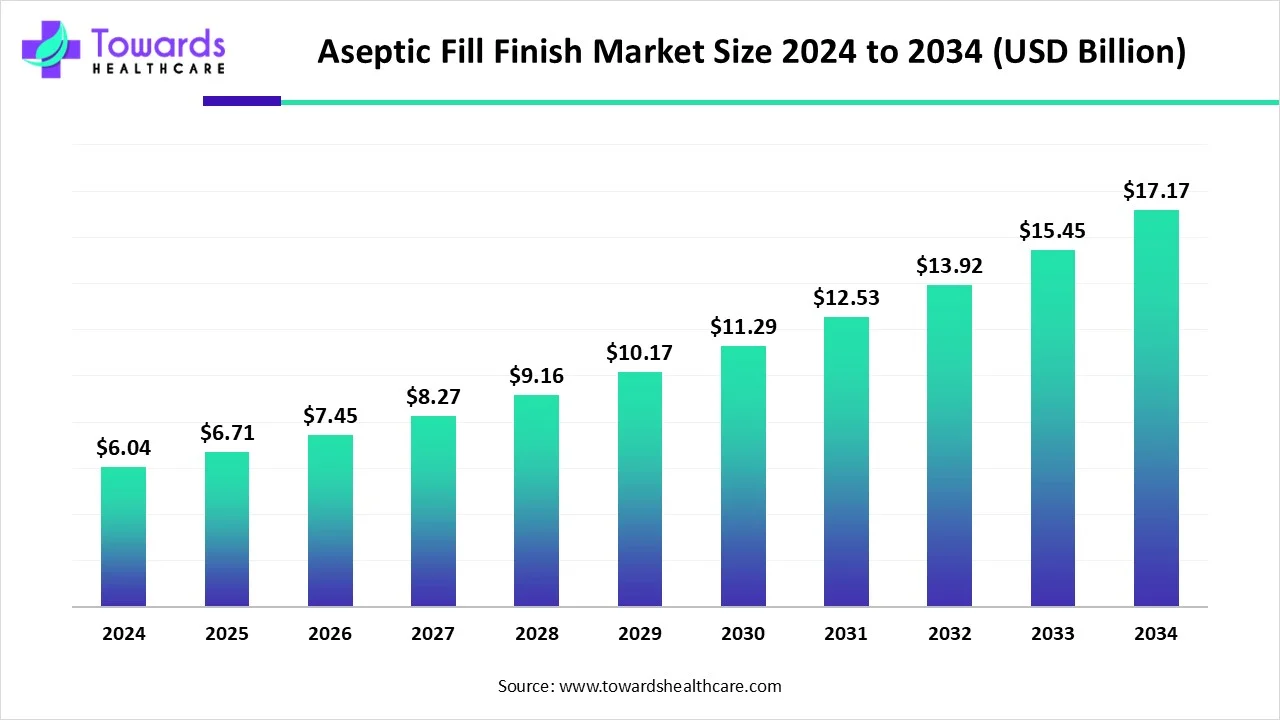 Ottawa, Nov. 05, 2025 (GLOBE NEWSWIRE) -- The global aseptic fill finish market size was valued at USD 6.04 billion in 2024 and is predicted to hit around USD 17.17 billion by 2034, rising at a 11.04% CAGR, a study published by Towards Healthcare a sister firm of Precedence Research.